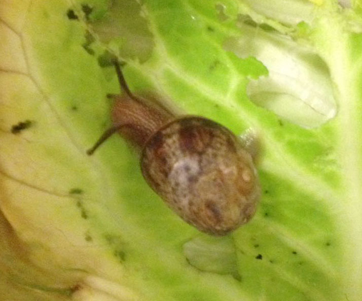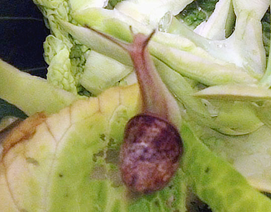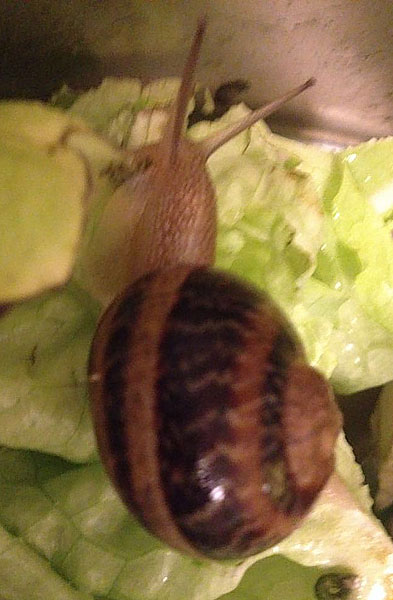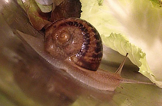 hier sind noch 3 schöne Fotos! MeineTochter bringt's lässig fertig. Inzw. benimmt sich die Schnecke wie eine Schnecke: kriecht unter Blättern rum, frisst ALTE Blätter, zu meinem Erstaunen, und schläft auf deren Unterseite, nicht mehr am "Plastik-Himmel".