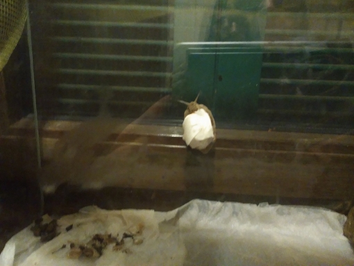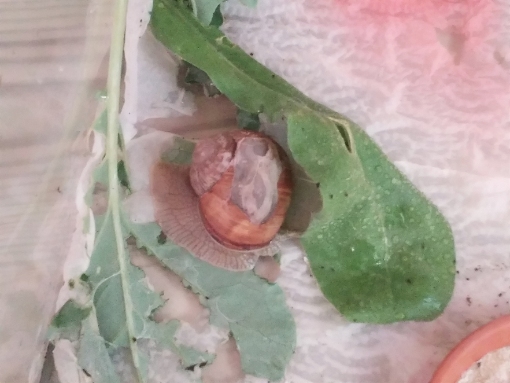 Die Schnecke macht einen vitalen Eindruck und kriecht herum. Im Moment ist sie in einem ausgedienten 30l-Aquarium mit feuchten Zewas, einem Kalkstein, den zerkleinerten Resten des leeren Schneckenhauses und zwei kleinen Kohlrabiblättern.