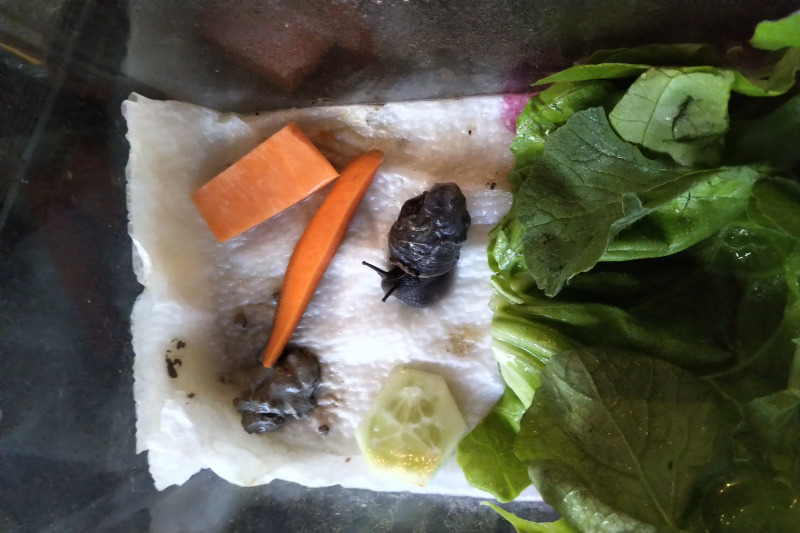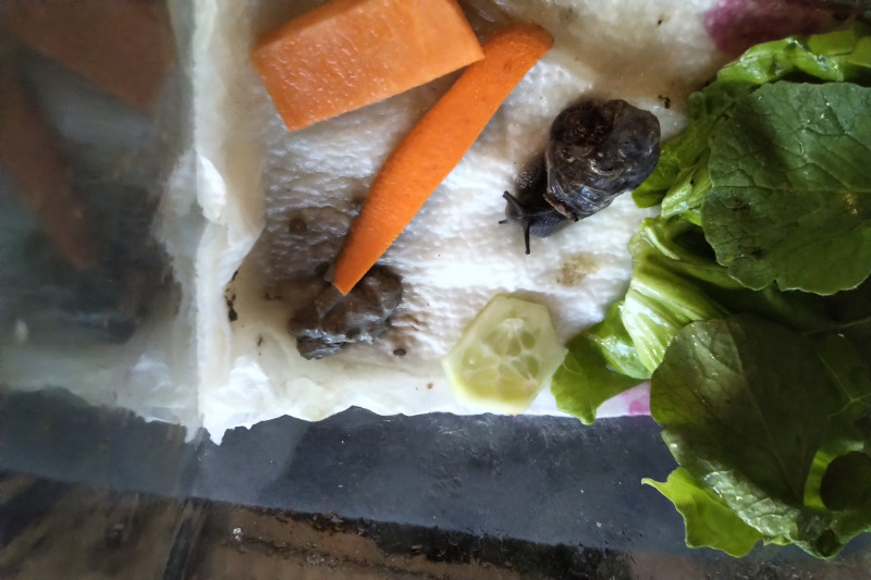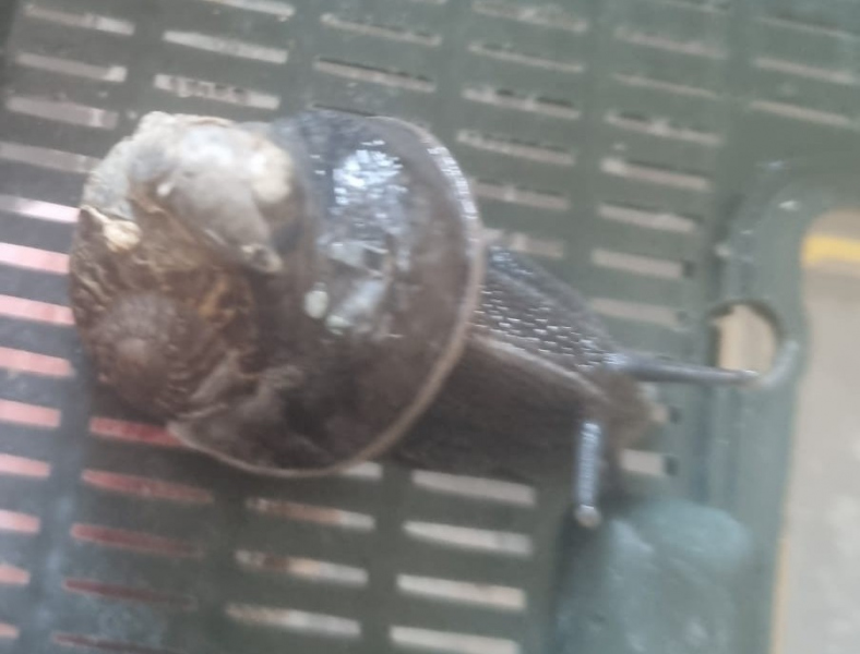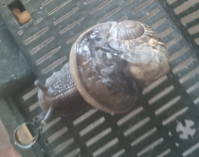 Der Patient ist seit gestern Abend bei mir. Der Transport verlief problemlos, mit einiger Geduld auch das anschließende Umsetzen in sein neues Zuhause (ich habe ihn mit einem Salatblatt angelockt und selbst kriechen lassen). Die Verletzungen sind sehr schwer, das steht außer Frage. Je nach Körperhaltung kann man sogar das Herz pulsieren sehen. Vielleicht war das der Knubbel? Der kleine Uli (habe mal "U" als Vorgabe genommen und mir erlaubt, ihm einen "richtigen" Vornamen zu geben) ist ziemlich tapfer, er frisst Salat, reagiert auf Feuchtigkeit und Licht, kriecht herum. Momentan sitzt er in einer oberen Ecke seines Terrariums. Hätte man ihn mir frisch verunfallt übergeben, hätte ich versucht Gehäusereste wieder anzukleben, wäre da ehrlich gesagt von einer Überlebenschance von 5% ausgegangen. Da er schon eine Woche durchhält und recht gut beieinander ist, habe ich aber große Hoffnung, dass er durchkommt. Vom Gehäuse ist nur noch ein kleiner Rest vorhanden, etwa 25-30%. Der Weichkörper scheint jedoch völlig unverletzt. Ich tue alles, damit er durchkommt.