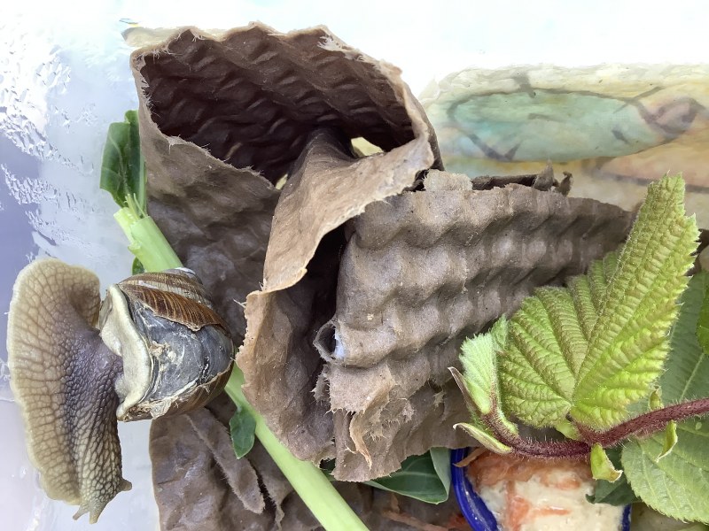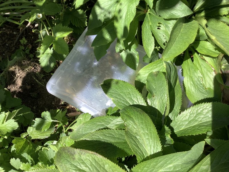 Stelle den Behälter jetzt bei den Temperaturen in den Halbschatten und lüfte natürlich mehrmals täglich. Ein Gitter konnte ich leider nicht anbringen, anstelle des Deckels, zumindest stundenweise dachte ich mir, für den Schneck um mehr an der Natur zu sein. Es versucht sonst ständig rauszukriechen und ein dichteres Gitter habe ich nicht, nur ein Kaninchengitter.