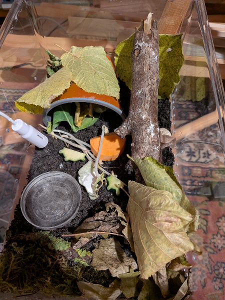 Evtl kannst Du ja ein größeres Zuhause für ihn herrichten, dann kannst Du es ihm richtig schön machen, Pflanzen rein, Laubecke, Flechtenäste etc