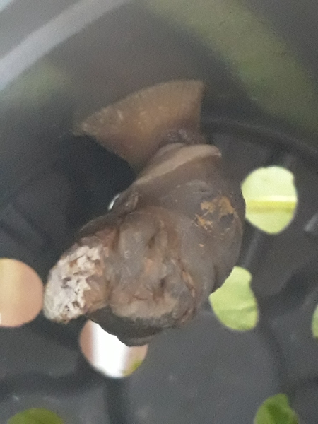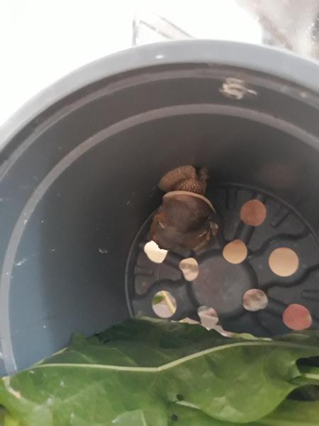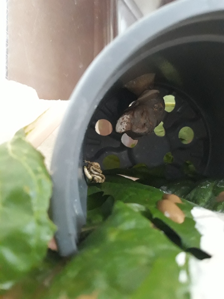 Was Beamy angeht, da ist nicht viel Bewegung zu verzeichnen. Weiterhin hängt sie im Pflanzentopf. Hat sich mit Verdauen beschäftigt und sieht, so meine ich, auch etwas anders aus. Leider ist es schwer zu erkennen. Das Teil, das hinten heraussteht, war ein halb abgefallenes Teil ihrer alten Schale. Es scheint in die Bauarbeiten integriert zu werden. Vielleicht kann jemand anders mehr erkennen?
