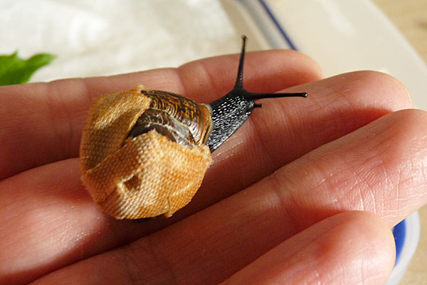 Also doch nicht leer. Nur böse durch die Mangel gedreht: die letzte Windung hatte einen riesigen Defekt und aus diesem Loch hing nun der Schneck heraus, mitsamt dem Lüngelchen. Das Häuschen hatte er also umgekehrt auf dem Rücken sitzen. Rückzugsmöglichkeit ins Häuschen nicht mehr vorhanden, Vertrocknen bzw. Ersticken vorhersehbar. Da der Schneck noch recht munter und umtriebig wirkte, habe ich das Kerlchen in meine Schneckenrettungsbox gepackt und mit nach Hause genommen.Auf der Fahrt länger geknobelt, wie ich das luxierte Schneckchen wieder durch die Mündung, die als Ring bzw. Tunnel noch erhalten war, fädeln sollte. Hatte zuhause nach längerem Probieren und gutem Zureden schließlich mit zwei nassen Q-Tipps das Schneckchen dazu bewegen können, sein Köpfchen durch diese Mündung zu stecken. Das Schwänzchen zog sie nach einiger Zeit auch noch hinterher. Aber noch hing das Haus verkehrt herum auf dem Rücken, sprich vorne und hinten vertauscht. Netterweise rückte sie das aber selbst gerade, das wollte ich nicht selbst drehen, da ich die Richtung nicht wußte und ihr das alle Organe abgedreht hätte. Dann konnte ich die zwei Defekte zuflicken. Leider waren die eigenen Scherben nicht vor Ort zu sehen, sie ist wohl vom Unfall noch etwas weiter gekrochen. Also mußten Weinbergschneckenbruchstücke und einige Krümel Dolomit herhalten. Das ging leidlich gut - ich muß beizeiten mal eine andere Pflastersorte ausprobieren. Auf einem nassen Häuschen kleben die schlecht, und wenn der neugierige Schneck ständig mit seinen Fühlern dazwischengeht, wirds auch nicht einfacher.