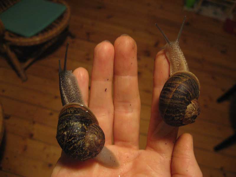 Zum anderen bin ich etwas verwundert über diese beiden Schnecken, da ich solche (recht dunklen) Schnecken garnicht kenne, und sie irgendwie auch nichts essen. Hatte nach meinem Drauftreten der Schnecke dann erstmal Salat und Löwenzahn hingelegt und Sepiaschale drüber geraspelt, weil ich dachte, vielleicht kann sie das für den Aufbau ihres Hauses ja gebrauchen. Aber beide haben nichts davon gegessen und scheinen auch diesen Margeritenstock nicht zu essen, sondern sich nur darin aufzuhalten (hatte den kürzlich für eine Woche bei meinen Eltern im Garten und schätze, da sind sie irgendwie reingekommen). Kennt jemand diese Schneckenart?