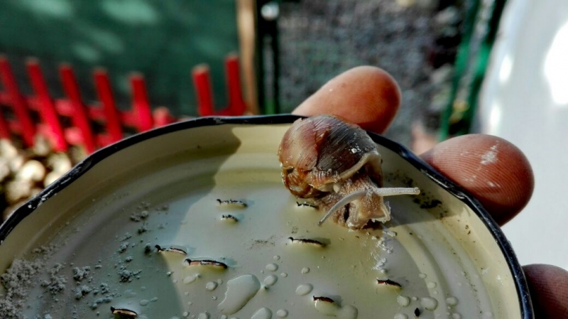 Die Schnecke sitzt nun erstmal in einem Einmachglas mit Luftlöchern, etwas feucht gehalten und mit Löwenzahn drin.