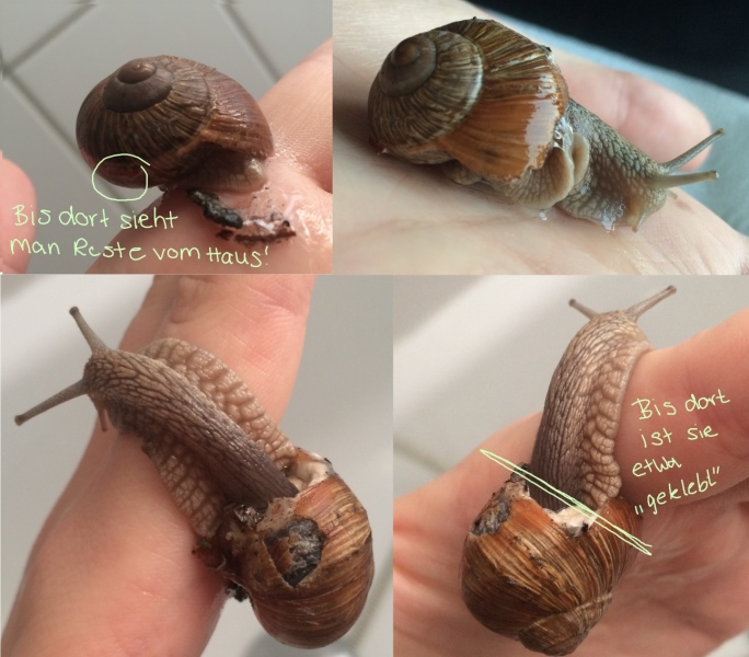 Ich habe gestern morgen eine Weinbergschnecke gesehen und als sie nach der Arbeit noch immer da war, wollte ich sie ins Gebüsch setzen und habe gesehen, dass die kleine ziemlich kaputt war. Ich habe sie mit nach Hause genommen (wo ein Terrarium mit einer anderen geklebten Weini (mittlerweile mit ihren 12 Babys!) wartete).