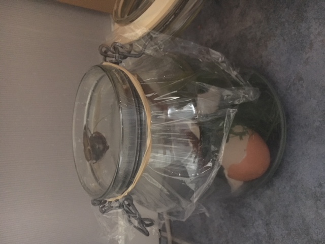 Nachdem ich einige Foreneinträge gelsen hatte, habe ich ein Einmachglas mit Erde, Gras, Blättern & einem Zweig befüllt (siehe Foto). Als Futter habe ich ein Stück Möhre & Eierschale rein gelegt. Ich habe ein paar Tropfen wasser rein geträufelt & es anschließend mit Frischhaltefolie abgedeckt, um es feucht zu halten. In die Folie habe ich Luftlöcher gepiekt. Das Glas stand erst im ausgebauten Keller, weil ich gelesen habe man solle es irgendwo hinstellen, wo es dunkel & ruhig ist. Da ich mir nicht sicher war, ob es nicht doch zu kalt ist, steht das Glas nun in der Küche unter einer Bank.