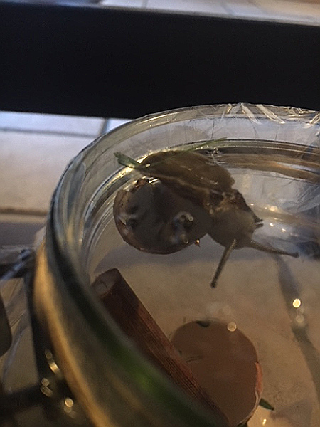 Die Schnecke hängt seit ca. 6 Stunden kopfüber an der Frischhaltefolie und war noch nicht am Essen.