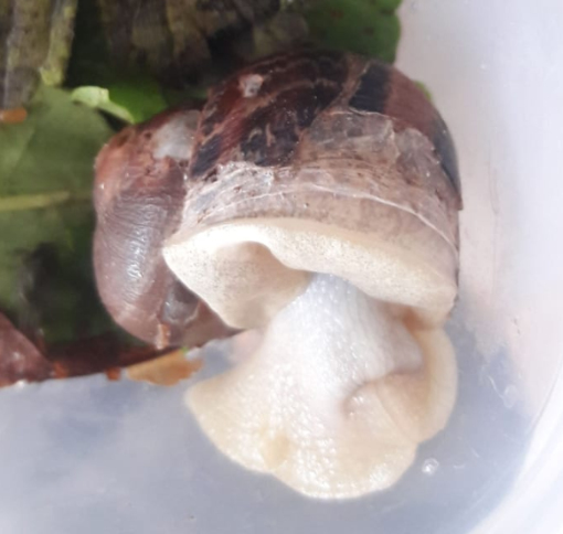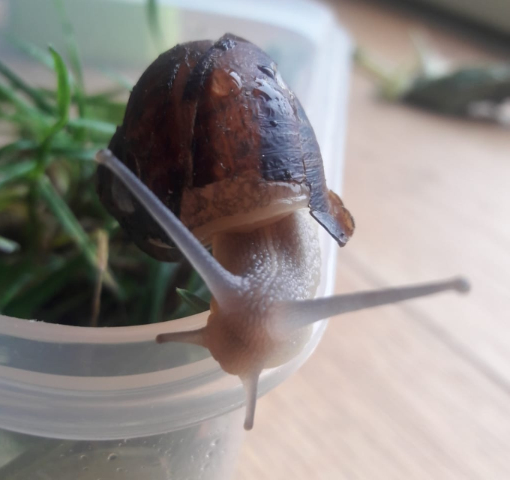 An Tag 1 hat das Gehäuse schlimmer ausgesehen mit mehreren losen Teilen, die ich nur versucht habe wieder an den richtigen Ort zu schieben, ohne was darunter zu beschädigen, hat meiner Meinung nach gut funktioniert. Sie wurde in einer großen Tupperbox untergebracht, 1 bis 2 mal täglich mit Leitungswasser besprüht, abgedeckt mit einer Plastikfolie mit Luftlöchern darin, unter Zimmertemperatur untergebracht. Unten feuchte Erde, darüber eine Mischung asu Gras, Wiesenkräutern, Laub, und Futter, das ich verteilt habe (geraspelte Karotte, extrem schmal geschnittener Apfel, Birne, Tomate, dann Brokkoliblätter, Karottengrün, Fenchelgrün). Davon hat sie eigentlich nur Karotte, ein bisschen Apfel gegessen. Schön geformten Kot jeden Tag abgesetzt. Habt ihr noch Futtertipps?