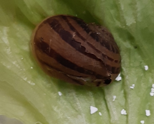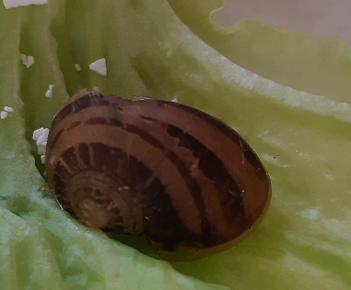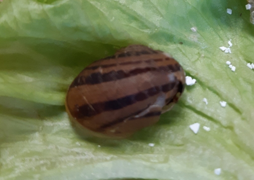 Cornu aspersum Jungtier mit starkem Gehäuseschaden