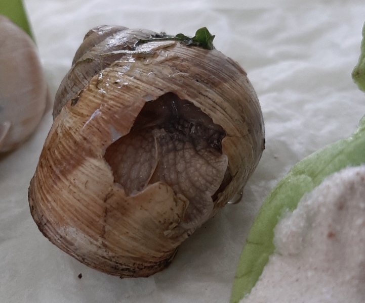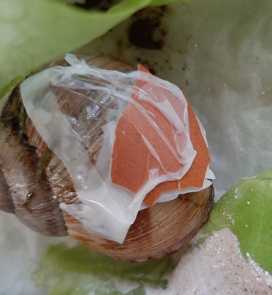 Ich habe soeben eine verletzte Weinbergschnecke im Garten gefunden. Sie hat ein Loch mit etwa einem Zentimeter Durchmesser recht weit vorn am Haus (siehe Bild). Sie sitzt nun in einer Plastikbox, mit Salat und Eibrei, außerdem mit feuchter Küchenrolle ausgelegt. Über die Box habe ich Frischhaltefolie gespannt. Ich habe mich nicht getraut am Loch herumzudoktorn... Vielleicht könnt ihr besser einschätzen, ob ich etwas machen sollte? Ich hänge ein Bild an