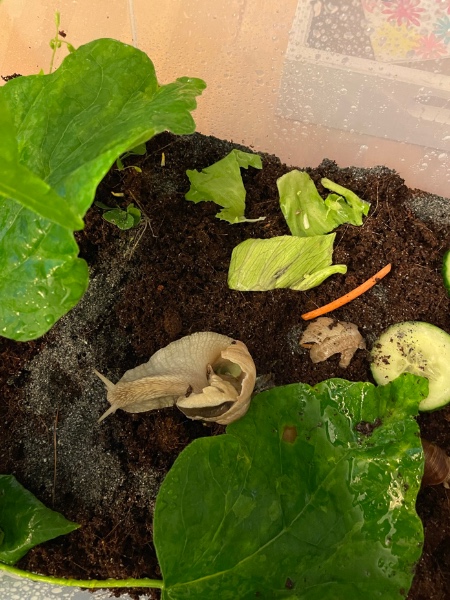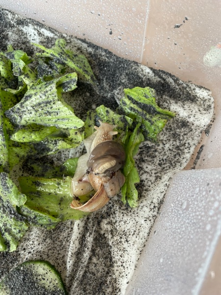 Nun wohnt sie also seit letzter Woche Montag (10 Tage her) bei uns in einer Plastikbox. Als Unterlage feuchtes Küchenpapier, darauf Gartenkalk (natürlich ohne Dünger etc) und Gurke, Löwenzahn und Salat.