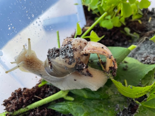 Man erkennt jetzt nicht mehr viel, aber ich habe es geschafft die Schnecke wieder zu sortieren und musste ihr dann aber eine Hausprothese aus einer Eierschale bauen, da sie sich sonst immer wieder verdreht hat… seit der Aktion sitzt die Schnecke unverändert da. Ich hoffe sie war einfach nur ko, ich bin es zumindest, meine Nerven… ich leide immer so mit!