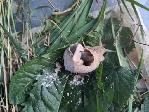 Wir haben ein ein provisorisches Terrarium (Ikea Plastikkiste mit nassen Küchrollenpapier und darüber diverse Blätter und Quecke) gebaut, in den Deckel ein Loch geschniten und mit Kartoffelnetz abgeklebt, so dass keine Fliegen hineinkönnen. Brennesselblätter, Löwenzahn, zerriebene Eierschalen und Haferflocken für als Futter und Reparaturmaterial gegeben. Und halten sie feucht. Derzeit betropfen wir sie mit Wasser. Morgen besorge ich Rasenkalk und ein Terrarium und eine kleine Sprühflasche Die Schnecke ist nicht extrem agil, aber in Bewegung und frißt, ruht aber auch sehr viel.