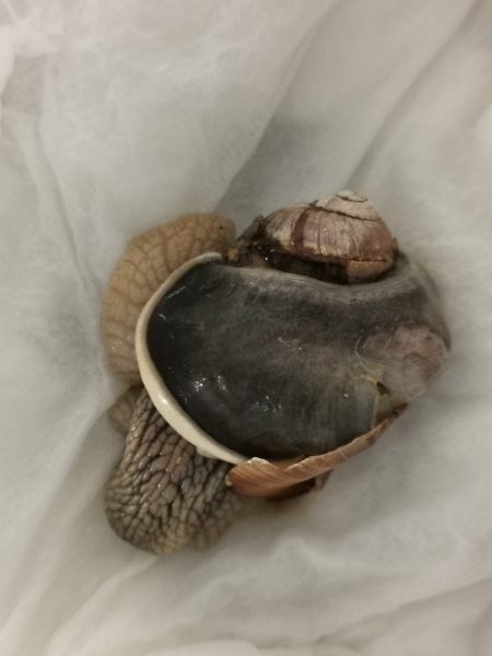 Gestern Nacht habe ich diese verletzte Winbergschnecke auf dem Fahrrad Weg gefunden sie hat fast ihr gesamtes Haus verloren,