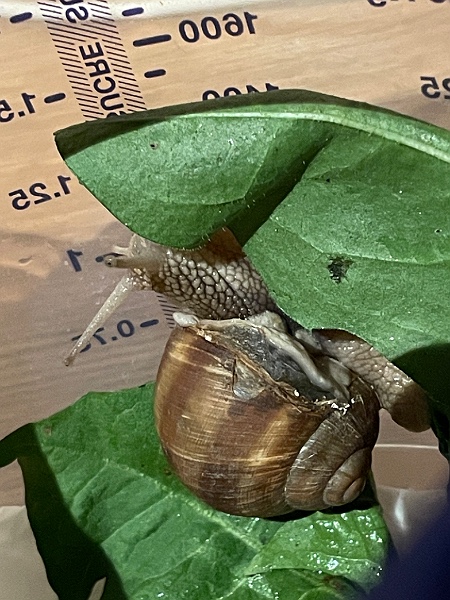 Ich habe sie und die Bruchstücke sofort mitgenommen und folgende Dinge gemacht.Habe einen Kunststoffbehälter mit Zewa (feucht) ausgelegt, Löwenzahn und Brennnessel gepflückt, Eierschale im Mörser zerrieben und die Schnecke auf eine Gurkenscheibe auf ein kleines Häufchen geriebene Eierschale gesetzt. Gestern ca 3 Mal besprüht.