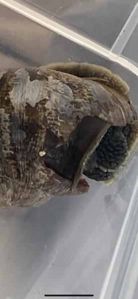 Gestern kam die Schnecke auch kurz auf ihrem Haus und hat sich bewegt. Seitdem sitzt sie aber nur auf der gleichen Stelle und scheint nicht zu fressen. Mittlerweile habe ich ihr auch etwas Möhre und eine Scheibe Gurke hineingelegt.