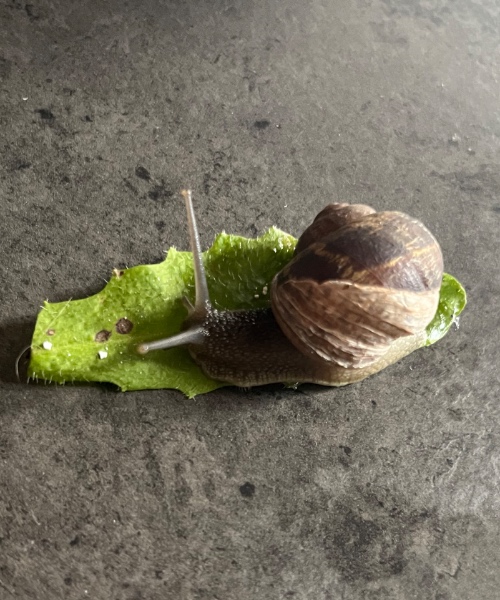 Bisher sitzt Schneckbert geschützt in einer Tupperdose mit Luftzufuhr auf feuchtem Zewa, ich wechsel täglich alles darin: frischer Löwenzahn, Gurke und anderes Gemüse wie Kohlblätter, Salat, Erdbeeren, etc..