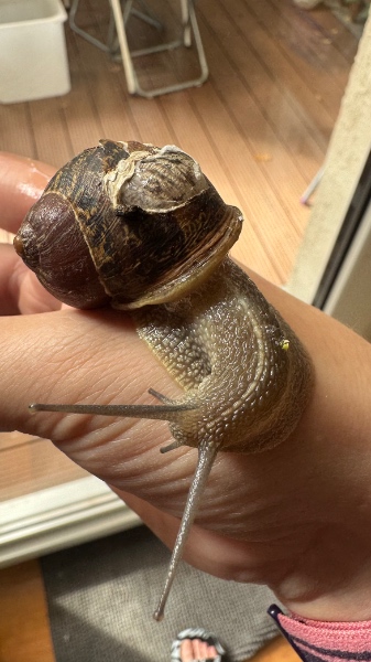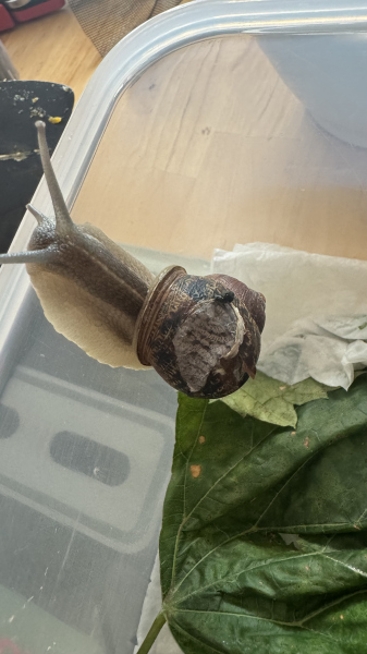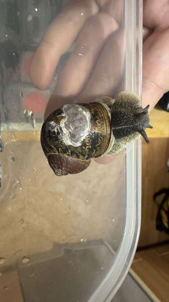 Auf die Gefahr hin, dass ich hier gleich gegrillt werde, weil man generell die Schnecke lieber in Ruhe machen lassen sollte als am Häuschen rum zu manipulieren: In diesem ganz speziellen Fall würde ich das Loch provisorisch verschließen. Denn jetzt richtet sie sich ja gerade so ein, dass sie da immer wieder rausguckt und auch so herumkriecht. So kann sich die Verletzung nicht schließen und vermutlich beschädigt sie auf Dauer dadurch auch die richtige Mündung.