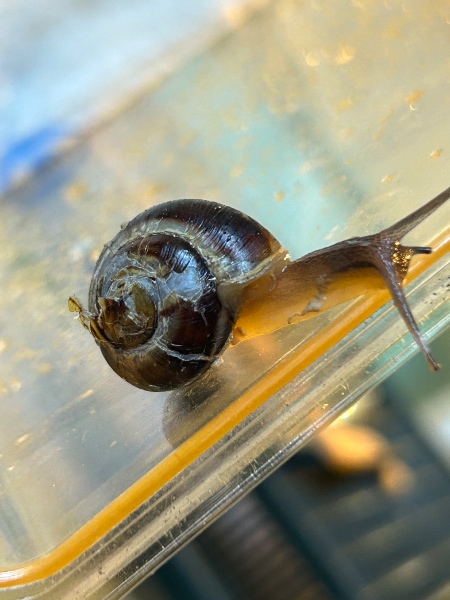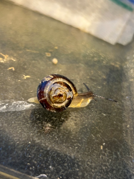 Vor knapp 2 Wochen habe diese Schnecke aufgefunden mit einem Gehäuseschaden. Am ersten Tag hat sie nur den Kalkbrei zu sich genommen und regelrecht verschlungen. Sie hat sich dann die ersten 5-7 Tage nur in ihrem Häuschen verschanzt und hing in ihrem Plastik Terrarium kopfüber an der Decke, zwischendurch ist sie mal 2-3 cm weiter gewandert.. Zwischenzeitlich war sie einmal erwacht und hat die angerührte Haferflocke auch gegessen, das restliche Futter hat sie nicht angerührt (Zucchini, Salat, Löwenzahn, Gurke, Kohlrabiblatt). Heute kam sie nun endlich länger nach draußen und erkundete das Terrarium. Ich habe das genutzt, um es zu säubern und neu her zu richten. Sie nahm ein Schlammbad, rührte das frisch hingelegte Essen (Zucchini, Kohlrabiblatt, Löwenzahn) nicht an, nahm kurz einen Bissen vom Kalkbrei und rührte den angebotenen Haferflockenbrei aber nicht an. Nun ist sie in ihrem Joghurtbecher verschwunden. Jetzt komme ich zu meiner eigentlichen Frage: an ihrem Häuschen ist leider ein Stück das absteht - ich habe es vorsichtig berührt - es hängt da ziemlich fest dran. Muss ich dieses Stück entfernen? Bisher hat es sie nicht gestört und ich habe Angst, dass ich ihr Haus dadurch noch mehr zerstöre. Meine zweite Frage: diese weiße Schicht auf dem Gehäuse (wo der Schaden war/ist), ist ein gutes Zeichen oder ? Sie hat mit der Reparatur also begonnen ? Vielen Dank für eure Antworten und liebe Grüße