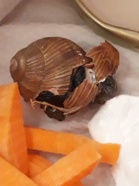 Hey ihr Lieben. Vorhin hab ich auf dem Gehweg eine weitere Schnecke gefunden, auf die wohl jemand draufgetreten ist. Ein Großteil des Gehäuses ist intakt, aber vorne sieht es ziemlich übel aus.
