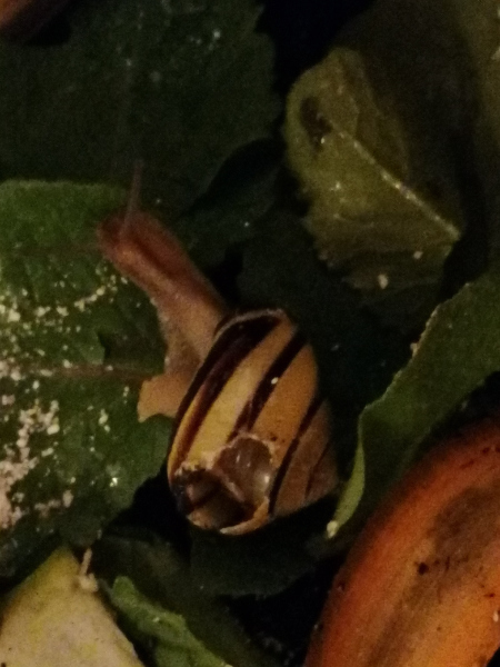 seh ich auf einem Stück aufgetautem Weg von weitem was gelbschwarzes liegen...also so ca 5 Meter vor uns, mein erster Gedanke...sieht aus wie ne Bänders...verwarf den Gedanken aber gleich, da Schnee, da kalt, kein Schneckenwetter. Wir schlappen also weiter und ich guck und guck und trau meinen Augen nicht. Da liegt eine Bänderschnecke! Mit Gehäuseschaden!So...hab sie dann zuhause untersucht, sie lebt, der Schaden sieht frisch aus, allerdings ist sie sehr weit zurückgezogen, bewegt sich aber. Ich hoffe sehr sie packt es und kommt aus der "richtigen" Öffnung