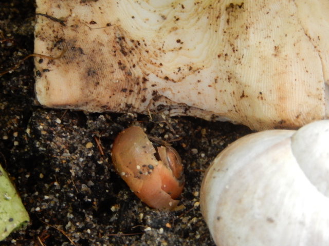 Ich hatte sie gestern bevor ich wegfuhr in eine kleine Transportbox (so eine Faunabox) mit feuchter aufgekalkter Terrarienerde (hatte ich für meine Fulicas vorbereitet) gesetzt, ihr Sepia, Radieschenblatt, Salatblatt, ein leeres Weinbergschneckenhäuschen ganz nah rundherum gelegt, bzw. teilweise drüber (nasses Salatblatt, damit sie feucht bleibt) gesetzt und viel reingesprüht.