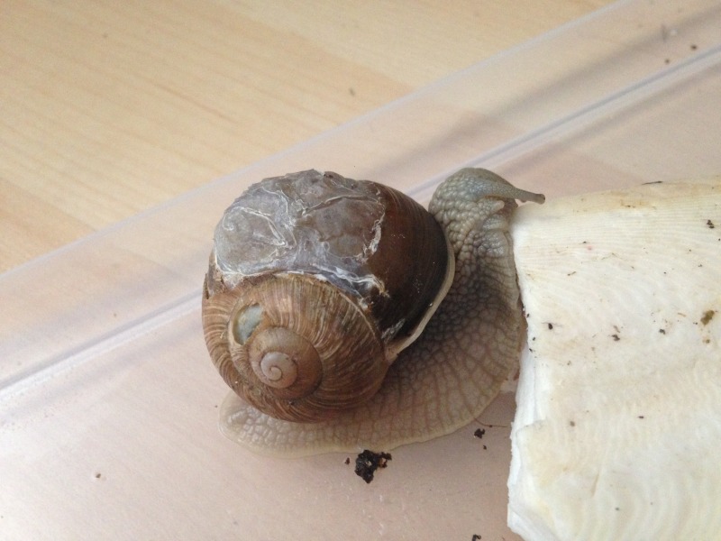 Ich hab ja derzeit sechs Verletzte Weinbergschnecken bei mir. Bei der mit der größten Wunde, ist gerade das Pflaster abgefallen. Sie hat innerhalb von nur einer Woche tolle Arbeit geleistet. Ich vermute die Haut ist noch sehr dünn; wollte sie nicht anfassen aus Angst die Schnecke zu verletzen. Würdet ihr ein neues Pflaster mit Frischhaltefolie drunter aufkleben oder soll ich es lieber offen lassen? Alles abwärts der Wunde hat sie neu angebaut!