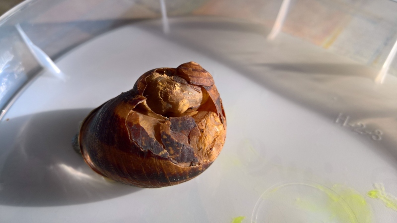 Einige Wochen zuvor konnte ich 2 kleinere Schnecken derselben Art nach 2 Wochen Pflege wieder in die Freiheit entlassen. Sie hatten die Gehäuseschäden repariert.
