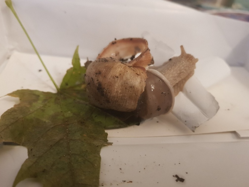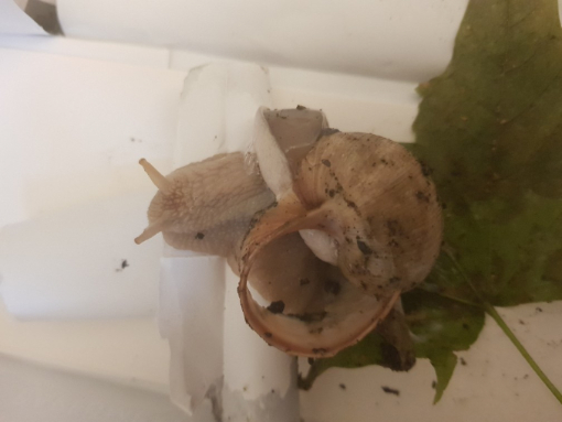 Wir haben überlegt, sie zu erlösen, haben aber beim kurzen googeln gelesen, dass Schnecken auch mit kaputtem Haus durchaus Überlebenschancen haben. Also haben wir sie erst mal mitgenommen.