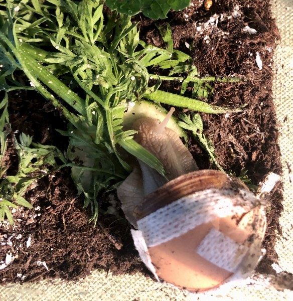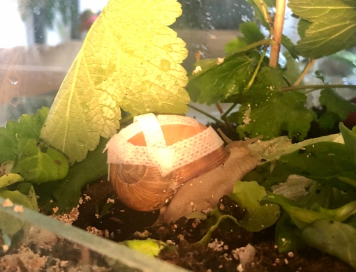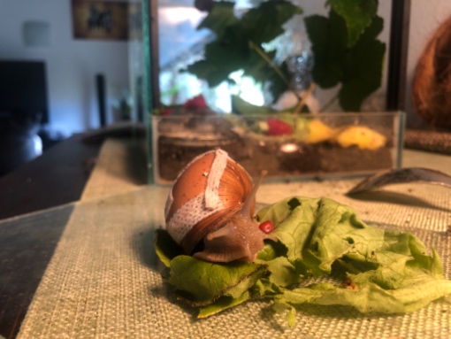 Wir hatten vor zwei Wochen eine kleine europäische Schnecke übernommen und ihr geholfen das Häuschen wieder in Schuss zu kriegen. Das hat auch alles wunderbar geklappt, war eine leichte Beschäftigung und war schnell wieder ganz und die kleine darf jetzt bald wieder raus, wenn sich das Häuschen noch ein wenig gefestigt hat.