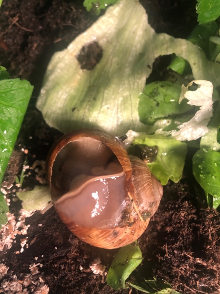 Wir haben ein Terrarium, zwei weitere kleine Weinbergschnecken sind schon drin. Einmal Gundula - die fsst geheilt ist und Daisy als Sozialkontakt. Blumenerde und Rindenmulch sowie Äste, Kalk in Form von gemörtelten Eierschalen sowie eine Schale Heilerdenpampe und Salat sowie eine Erdbeere sind gerade die Grundausstattung.