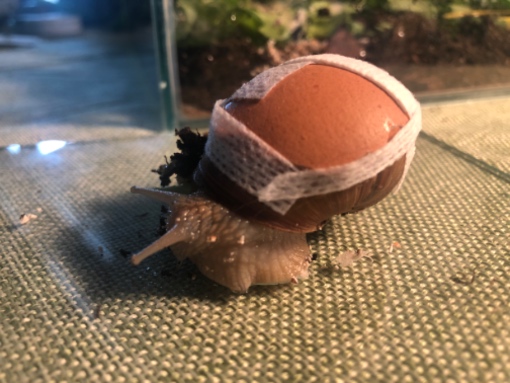 Sie scheint nicht verletzt zu sein, ist agil und frisst. Jetzt habe ich nach bestem Gewissen und nach den Einträgen von euch wie man ein Schneckenhaus unterstützt - das so stark beschädigt ist - gehandelt und sie mit Eierschalen und Leukoplast repariert. Anbei die Bilder!