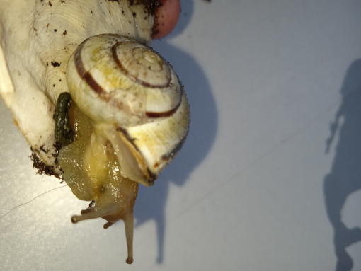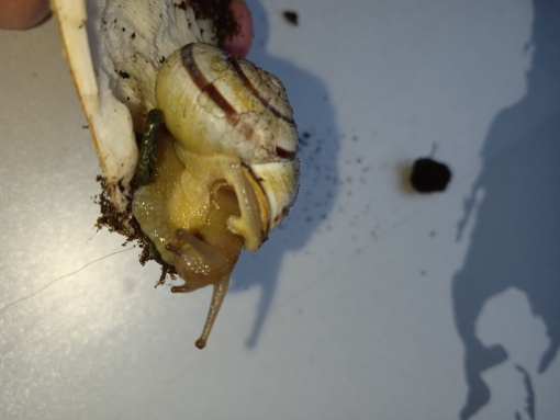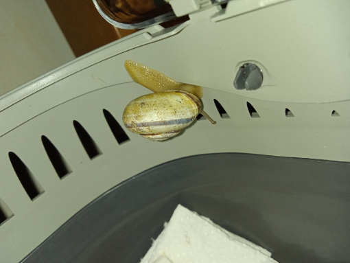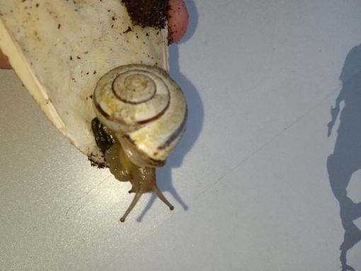 grade beim Futterwechsel fand ich meine Hain-Bänderschnecke Vanille so vor. Sie sitzt grade schön brav an der Sepiaschale. Heute morgen war das glaub ich noch nicht so.