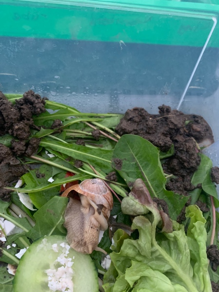Wir haben sie in eine Schale mit etwas Erde, Löwenzahn und Eierschale gesetzt.
