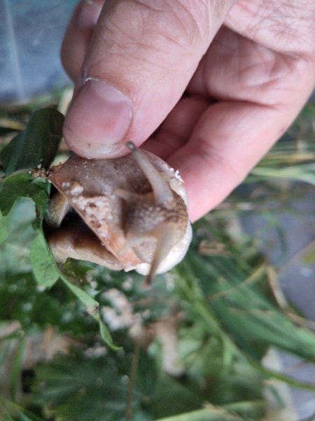 Wir haben ein ein provisorisches Terrarium (Ikea Plastikkiste mit nassen Küchrollenpapier und darüber diverse Blätter und Quecke) gebaut, in den Deckel ein Loch geschniten und mit Kartoffelnetz abgeklebt, so dass keine Fliegen hineinkönnen. Brennesselblätter, Löwenzahn, zerriebene Eierschalen und Haferflocken für als Futter und Reparaturmaterial gegeben. Und halten sie feucht. Derzeit betropfen wir sie mit Wasser. Morgen besorge ich Rasenkalk und ein Terrarium und eine kleine Sprühflasche Die Schnecke ist nicht extrem agil, aber in Bewegung und frißt, ruht aber auch sehr viel.