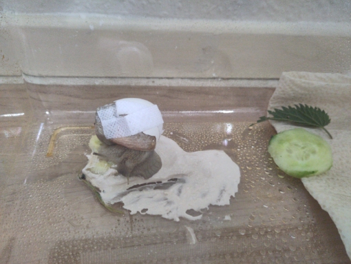 - Wie könnte ich das Schneckenhaus reparieren??? (Derzeit lege ich immer eine Eierschale über das Gehäuseloch (betropfe es mit Wasser), wenn Sie schläft)