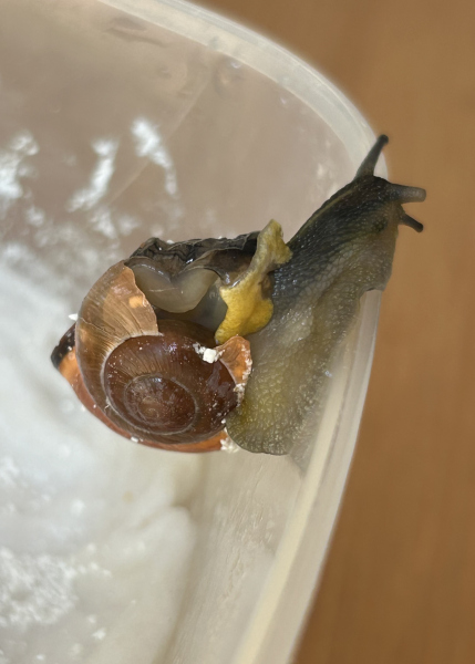 Heute habe ich eine Schnecke mit einem großen Loch im Gehäuse gefunden. Habe sie auf nasses Zewa + Eierschalen gesetzt, Brennnessel, Löwenzahn und Gurke als Futter mit rein gelegt.