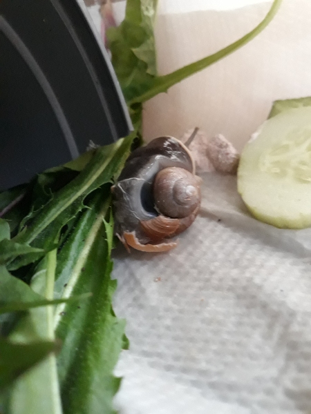 Ich habe eine Schnecke, wohl Weinbergschnecke, mit einem grossen Gehäuseschaden gefunden und sie mal mitgenommen, da sie noch recht lebendig aussah.