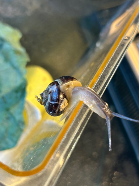 Vor knapp 2 Wochen habe diese Schnecke aufgefunden mit einem Gehäuseschaden. Am ersten Tag hat sie nur den Kalkbrei zu sich genommen und regelrecht verschlungen. Sie hat sich dann die ersten 5-7 Tage nur in ihrem Häuschen verschanzt und hing in ihrem Plastik Terrarium kopfüber an der Decke, zwischendurch ist sie mal 2-3 cm weiter gewandert.. Zwischenzeitlich war sie einmal erwacht und hat die angerührte Haferflocke auch gegessen, das restliche Futter hat sie nicht angerührt (Zucchini, Salat, Löwenzahn, Gurke, Kohlrabiblatt). Heute kam sie nun endlich länger nach draußen und erkundete das Terrarium. Ich habe das genutzt, um es zu säubern und neu her zu richten. Sie nahm ein Schlammbad, rührte das frisch hingelegte Essen (Zucchini, Kohlrabiblatt, Löwenzahn) nicht an, nahm kurz einen Bissen vom Kalkbrei und rührte den angebotenen Haferflockenbrei aber nicht an. Nun ist sie in ihrem Joghurtbecher verschwunden. Jetzt komme ich zu meiner eigentlichen Frage: an ihrem Häuschen ist leider ein Stück das absteht - ich habe es vorsichtig berührt - es hängt da ziemlich fest dran. Muss ich dieses Stück entfernen? Bisher hat es sie nicht gestört und ich habe Angst, dass ich ihr Haus dadurch noch mehr zerstöre. Meine zweite Frage: diese weiße Schicht auf dem Gehäuse (wo der Schaden war/ist), ist ein gutes Zeichen oder ? Sie hat mit der Reparatur also begonnen ? Vielen Dank für eure Antworten und liebe Grüße