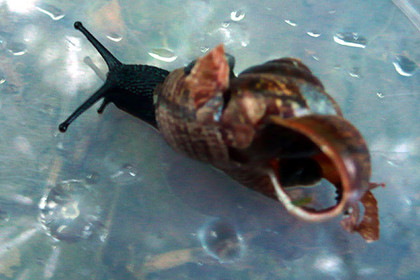 Also doch nicht leer. Nur böse durch die Mangel gedreht: die letzte Windung hatte einen riesigen Defekt und aus diesem Loch hing nun der Schneck heraus, mitsamt dem Lüngelchen. Das Häuschen hatte er also umgekehrt auf dem Rücken sitzen. Rückzugsmöglichkeit ins Häuschen nicht mehr vorhanden, Vertrocknen bzw. Ersticken vorhersehbar. Da der Schneck noch recht munter und umtriebig wirkte, habe ich das Kerlchen in meine Schneckenrettungsbox gepackt und mit nach Hause genommen.Auf der Fahrt länger geknobelt, wie ich das luxierte Schneckchen wieder durch die Mündung, die als Ring bzw. Tunnel noch erhalten war, fädeln sollte. Hatte zuhause nach längerem Probieren und gutem Zureden schließlich mit zwei nassen Q-Tipps das Schneckchen dazu bewegen können, sein Köpfchen durch diese Mündung zu stecken. Das Schwänzchen zog sie nach einiger Zeit auch noch hinterher. Aber noch hing das Haus verkehrt herum auf dem Rücken, sprich vorne und hinten vertauscht. Netterweise rückte sie das aber selbst gerade, das wollte ich nicht selbst drehen, da ich die Richtung nicht wußte und ihr das alle Organe abgedreht hätte. Dann konnte ich die zwei Defekte zuflicken. Leider waren die eigenen Scherben nicht vor Ort zu sehen, sie ist wohl vom Unfall noch etwas weiter gekrochen. Also mußten Weinbergschneckenbruchstücke und einige Krümel Dolomit herhalten. Das ging leidlich gut - ich muß beizeiten mal eine andere Pflastersorte ausprobieren. Auf einem nassen Häuschen kleben die schlecht, und wenn der neugierige Schneck ständig mit seinen Fühlern dazwischengeht, wirds auch nicht einfacher.