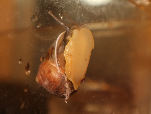 Wir waren vier Tage in Urlaub, nicht gesehen haben wir die Schnecken aber nur zwei Tage (am An- und Abreisetag war alles ok). Als Proviant hatten sie Gurke und Eisbergsalat sowie Sepia. Am nächsten Tag der Schock - eine der Schnecken sah unfassbar komisch aus, ich war der Überzeugung, dass sie tot ist. Sie quoll aus ihrem Häuschen, man hat fast keinen Körper gesehen, es sah aus wie eine Blase. Der Mantelsaum war total aufgequollen. Ich habe sie dann angesprüht und siehe da: Die Schnecke kam komplett zum Vorschein und schneckte fröhlich umher. Ich habe sie separiert, seitdem ist sie auf Diät. Später dasselbe Problem: Der Mantelsaum ist geschwollen, sie kommt nicht ins Häuschen. Nach einer Auffoderung kam sie aber auch hier wieder raus und kroch umher - sobals sie kriecht, sieht sie ganz normal aus. Dabei setzte sie auch ordentlich Kot ab - ich habe dabei durch das Entfernen des Kots etwas "nachgeholfen", da ich das Gefühl hatte, dass sie den nicht richtig rausbekommt und irgendwie verstopft ist. Tatächlich wurde sie danach viel munterer, schwoll ab und setzte direkt eine ordentliche weitere Ladung ab. Ich bilde mir eine gelbliche Verfärbung des Fußes ein.