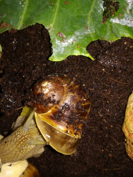 Etwa vor 24 h war noch alles gut, meine beiden Schnecken saßen auffällig oft aufeinander und die nicht betroffene Schnecke hatte einen massiven Hauswachstum (1 cm innerhalb von wenigen Sekunden rausgeschoben o.O) und die jetzt kranke Schnecke hat fröhliche zugeschaut bzw. das neue Stück "betastet".