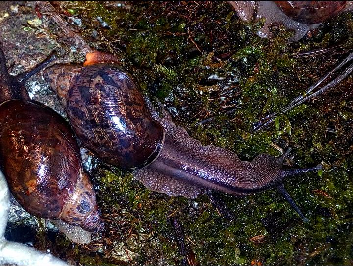 Hier eine wahre Schönheit, sie stammt von Sangmelima, südliches Kamerun. Vielen Dank an Susann. Nach langem hin und her überlegen ob ich es mit dieser doch nicht einfachen Art versuchen sollte, machte der Satz von Susann "wenn du Limis kannst, dann geht die auch" und das die F3 doch viel stabiler und nicht mehr so empfindlich ist den Ausschlag. Mein größtes Problem ist die Temperatur, da vor allem jetzt im Sommer die Temperaturen doch über 26 C liegen. Ich habe sie jetzt mit Grunzschnecken vor meiner Wohnungstür, da ist es jetzt doch noch bis 3 C kühler und momentan bei 24 C. Ich habe mir die Beiträge immer gerne von dieser Schnecke in Susann Galerie angeschaut und bereue es jetzt nicht sie genommen zu haben, mir gefällt das dunkle mit der dezenten Tüpfelzeichnung, was vor allem die Jungschnecken zeigen. Ich habe mir Susann´s Pflegetipps sehr zu Herzen genommen und viel Totfaules Holz, auch als Äste mit Moos und Flechten bewachsen, sowie Moos als Feuchtigkeitsspeicher auf dem Substrat. Sie können sich unter dem Holz und Laub verstecken, da sie Baumschnecken sind und den Boden nicht zum verbuddeln nutzen. Sie bekommen wie bei Susann zum normalen Angebot von Salat, Zucchini, Süßkartoffel, vor allem ihre Lieblingsfutter Pilze.