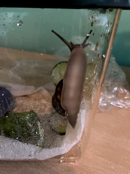 Die kleine Kimmy (wegen der Serie unbreakable Kimmy Schmidt :) ) hat die Nacht überstanden und pappt noch immer am Deckel, bewegt sich aber nach wie vor dort hin und her. Ich kann nicht gut erkennen ob sich an dem Häuschen schon was getan hat, glaube aber dass die Haut schon etwas dicker und weniger durchsichtig geworden ist.