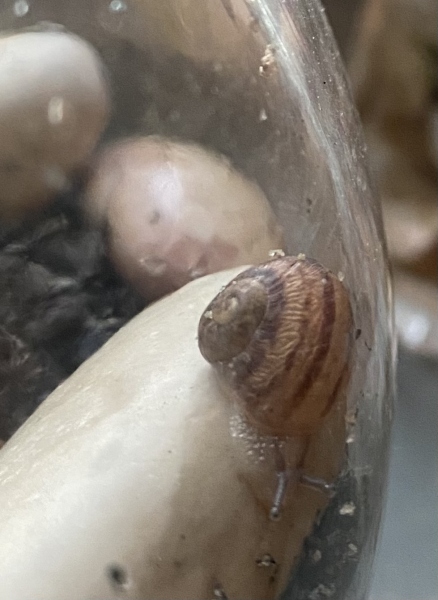 Im Garten und auf der Terasse lebten Häuschenschnecken ohne Ende. Der Garten und die Terasse war voll mit Sukkulenten, in denen sich die Schnecken austobten. Wir haben uns einige Ableger mit nach Hause genommen und eingepflanzt. Nach ca. 14 Tagen ist mir eine Babyschnecke in den Sukkulenten aufgefallen. Ich habe ein Glasgefäß fertig gestaltet und das Schnecki dort hinein getan.