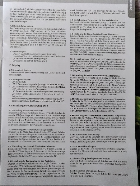 Jedenfalls ist es mir kaum möglich, die Texte OHNE einen Trixie-Thermostaten zu verstehen. Wahrscheinlich ist es ebenso schwierig, so ein Trixie-Teil OHNE die Bedienungsanleitung zu programmieren...