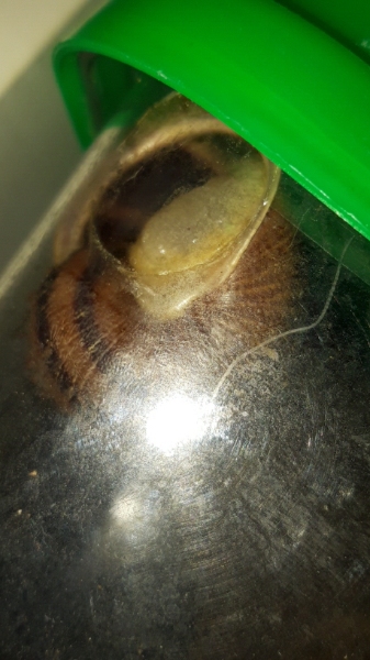 Genu ist mit 3 anderen Schnecken zusammen im Terrarium und hat sich am 17.06 (nachdem er etwas unterwegs war) an die Decke geklebt und hat als einzige im Terrarium angefangen Trockenruhe zu machen (haben wir zumindest so vermutet). Da es zu dieser Zeit auch wieder Wärmer draußen geworden ist, haben wir uns auch nichts dabei gedacht. Genu ist dann nochmal am 22.06 von der Decke geplumst und ist dann auch wach geworden, hat kurz die Reste von seiner Verklebung vom Häuschen geknabbert und hat sich dann diesmal an die Scheibe angeklebt. Da ist uns schon aufgefallen, dass der Körper an der Seite des Atemlochs mehr ins Haus gezogen ist als der Rest, da aber noch genug von der Schnecke zu sehen war, haben wir auch wieder nichts großartig dabei gedacht.