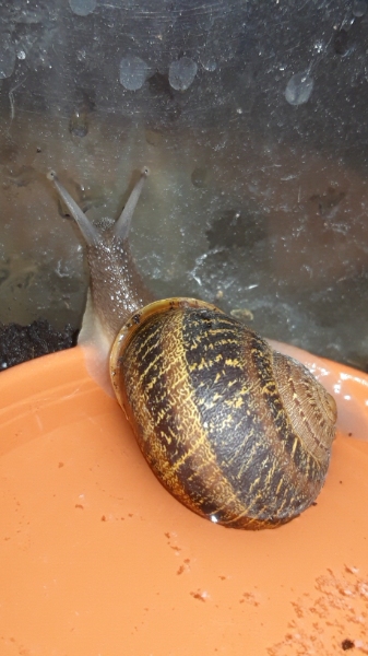 Die Haltungsparameter sind wie immer eine Feuchtigkeit von ca. 60% im Terrarium, durch die Wetterumschwünge wahrscheinlich von der Temperatur her etwas belastender für die Schleimer. Die Schnecken bekommen wegen der Hitze in letzter Zeit etwas mehr Gurke, damit sie auch auf diesem Wege mehr Wasser zu sich nehmen, ansonsten wie immer Zucchini, Süßkartoffel, Möhren, Salat und manchmal anderes Gemüse abwechselnd. Sepia, genug Wasser und Heilerde haben die natürlich immer zur Verfügung gestellt.