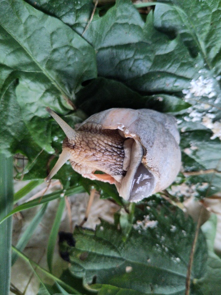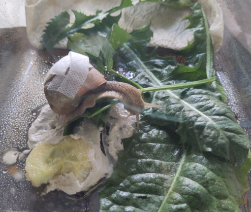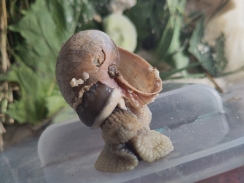 Wir haben ein ein provisorisches Terrarium (Ikea Plastikkiste mit nassen Küchrollenpapier und darüber diverse Blätter und Quecke) gebaut, in den Deckel ein Loch geschniten und mit Kartoffelnetz abgeklebt, so dass keine Fliegen hineinkönnen. Brennesselblätter, Löwenzahn, zerriebene Eierschalen und Haferflocken für als Futter und Reparaturmaterial gegeben. Und halten sie feucht. Derzeit betropfen wir sie mit Wasser. Morgen besorge ich Rasenkalk und ein Terrarium und eine kleine Sprühflasche Die Schnecke ist nicht extrem agil, aber in Bewegung und frißt, ruht aber auch sehr viel.